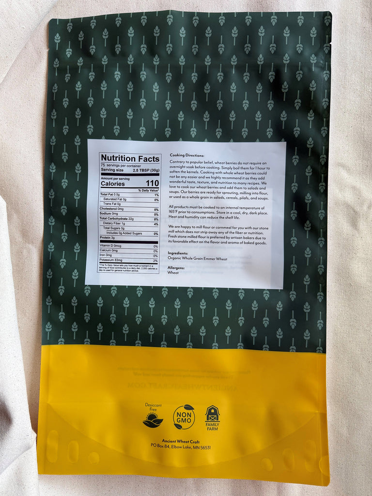 These organic Emmer berries are rich in fiber, minerals, healthy fats, and protein. Emmer is an ancient wheat variety that contains gluten but may be easier to digest than modern wheat.